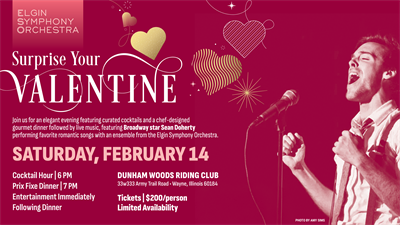 Be serenaded by Broadway Star Sean Doherty, accompanied by an Elgin Symphony Orchestra ensemble, at a romantic dinner event on Valentine’s Day at the Dunham Woods Riding Club.